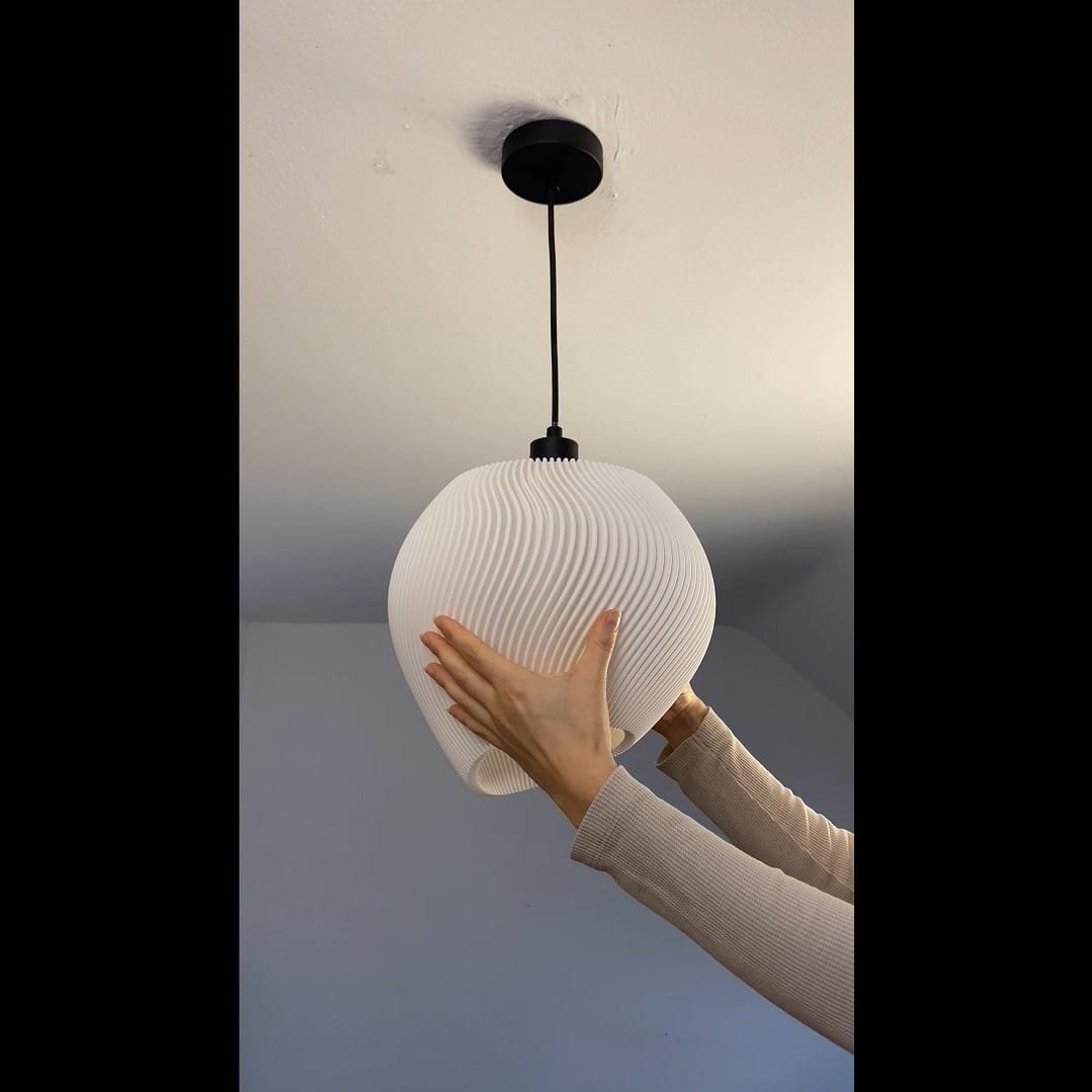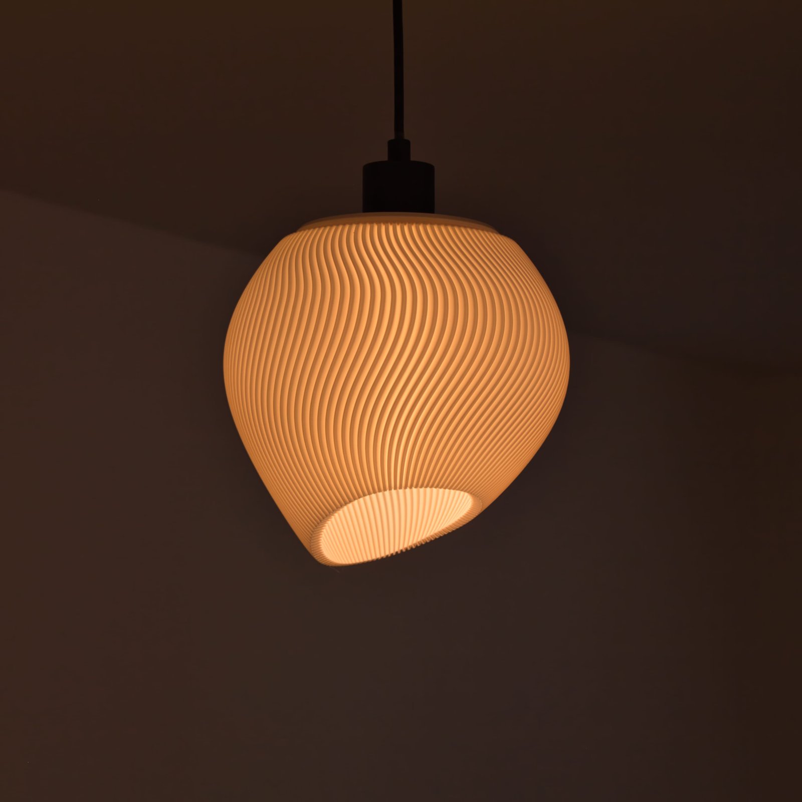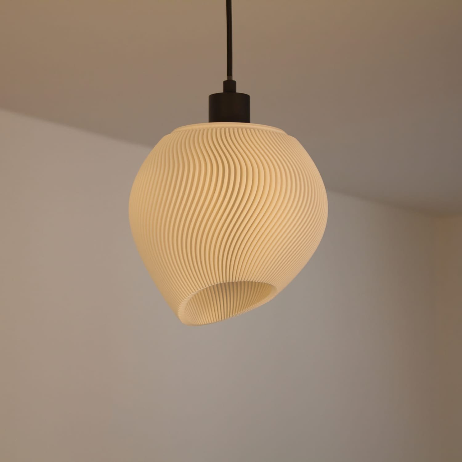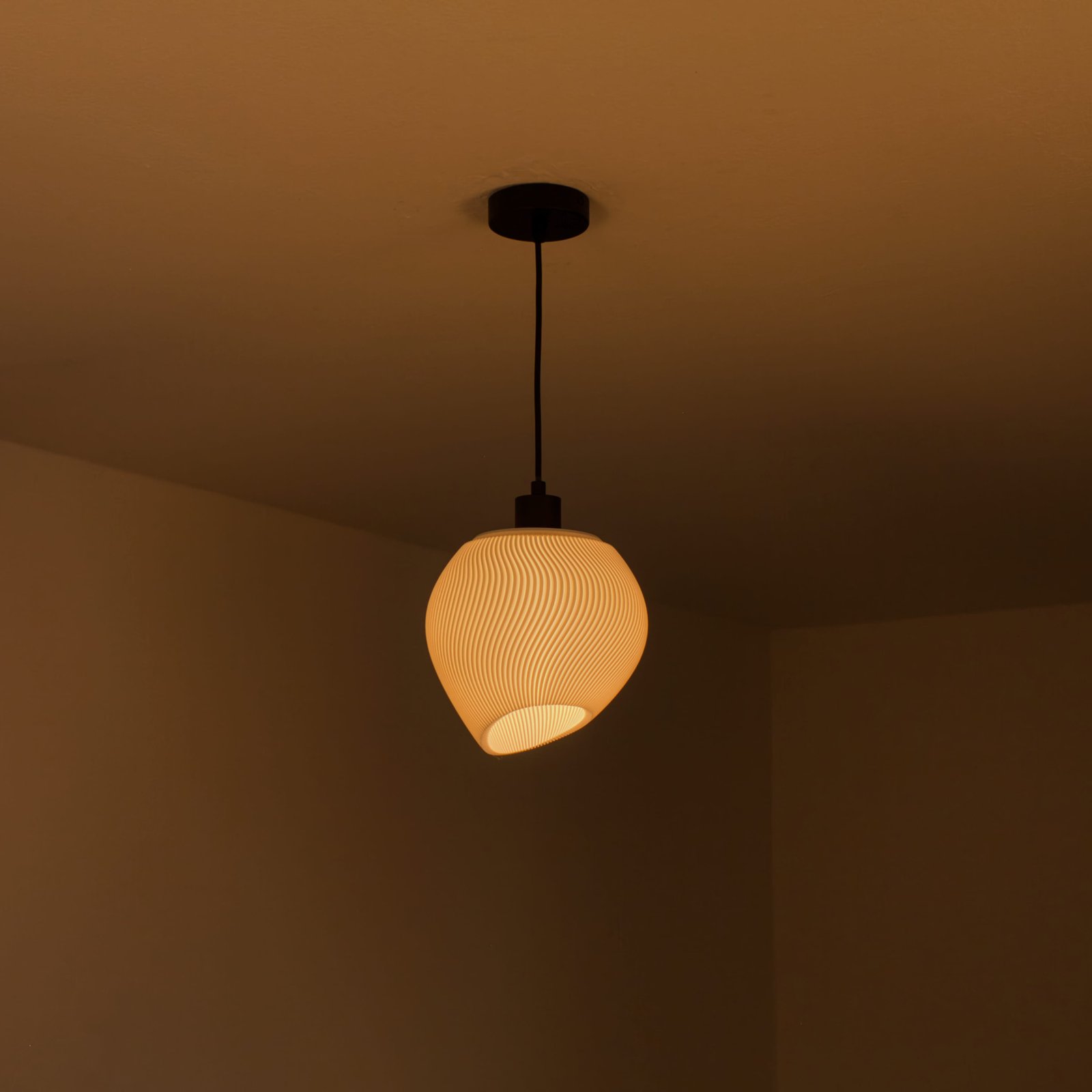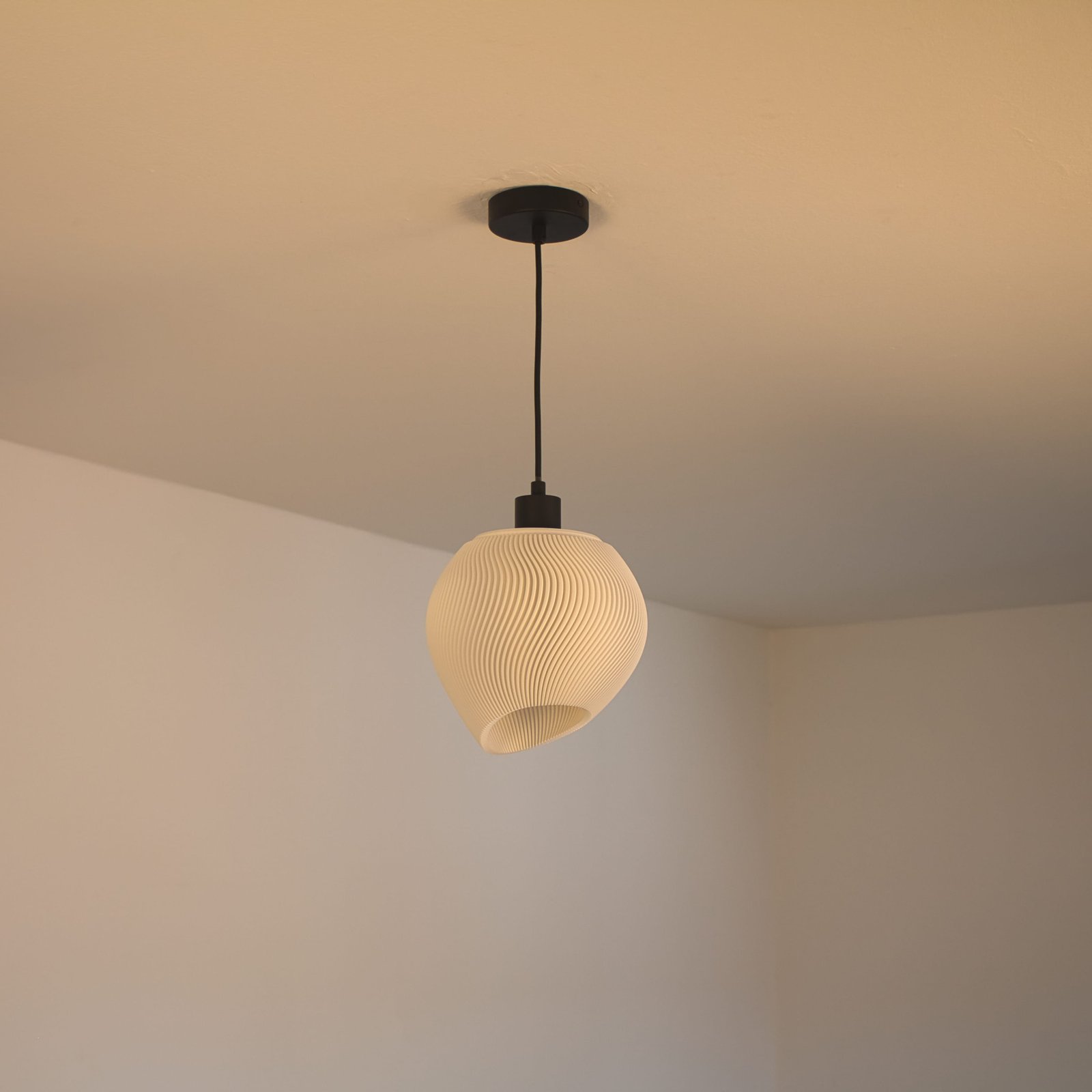 Unser Auris Lampenschirm in der Größe S an einer 1-flammigen Pendel Armatur aus Metall.