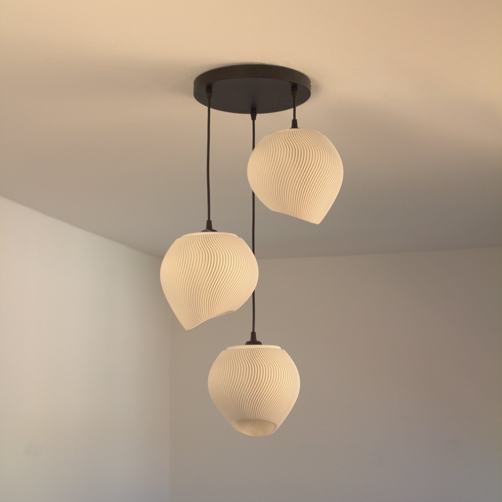 Unsere Auris Lampenschirme in der Größe S an einer runden Metall Armatur mit drei Pendeln.Die einzelnen Pendellängen lassen sich bei der Montage individuell einstellen. Wenn die Deckenarmatur einmal hängt, lassen sich die Schirme mit Hilfe unserer selbst entwickelten Magnetaufhängung blitzschnell und ohne Werkzeug auf und abhängen. Das sorgt nicht nur für eine einfache und stressfreie Montage, sondern gibt dir auch maximale Flexibilität in deiner Raumgestaltung. Du kannst ganz spontan verschiedene Schirmdesigns in deinem Zuhause hin und her tauschen, so wie es dir gerade am besten gefällt.Die Helligkeit und Farbtemperatur lassen sich über die Wahl der E27 Glühbirnen nachträglich anpassen.
