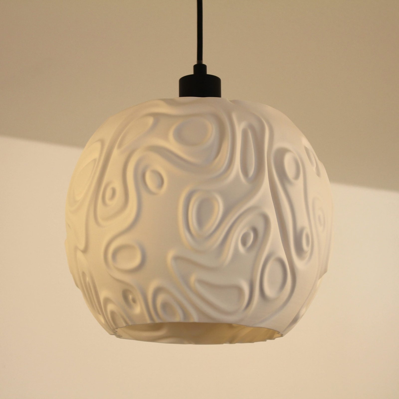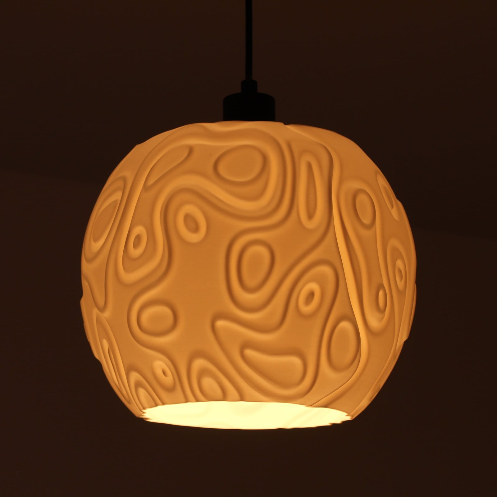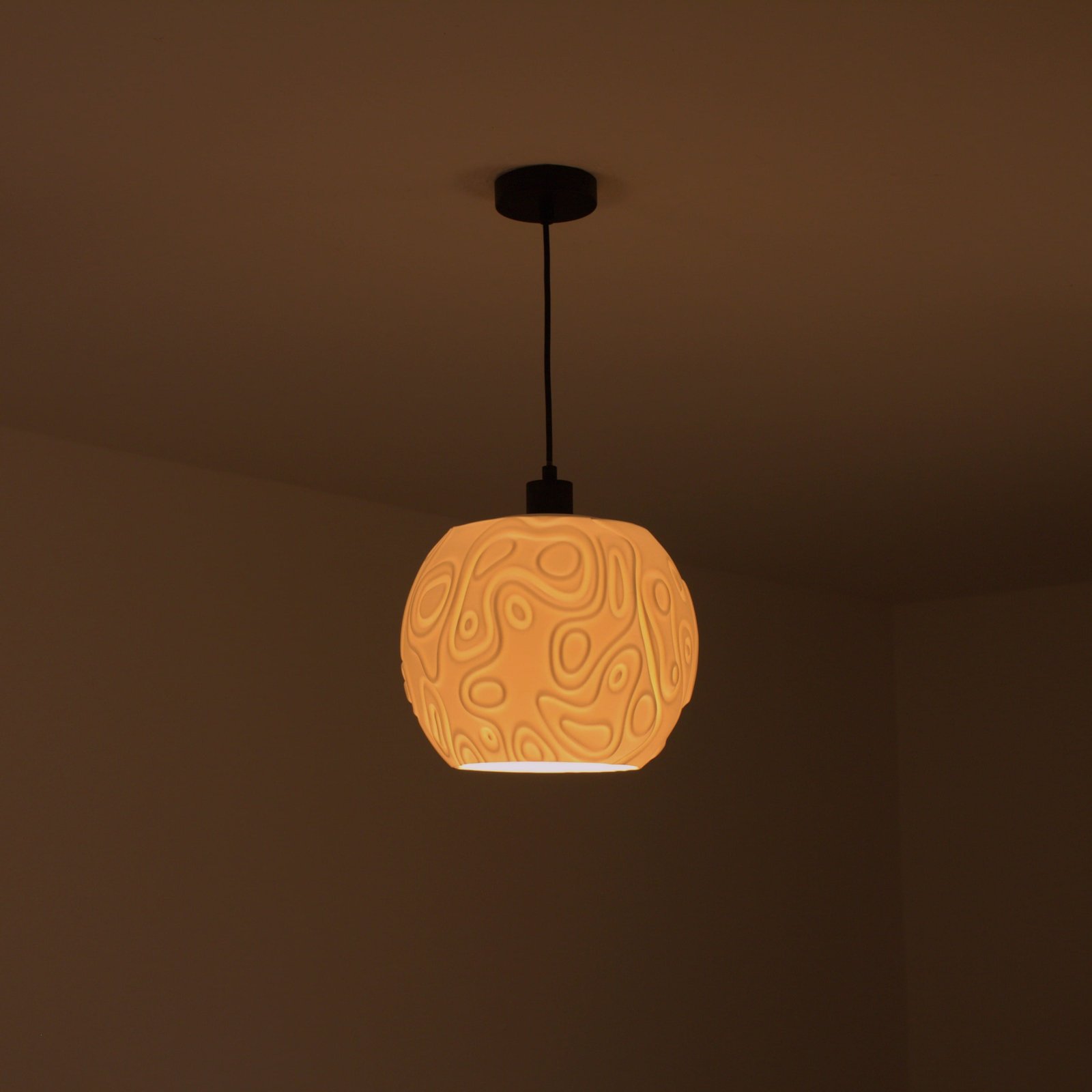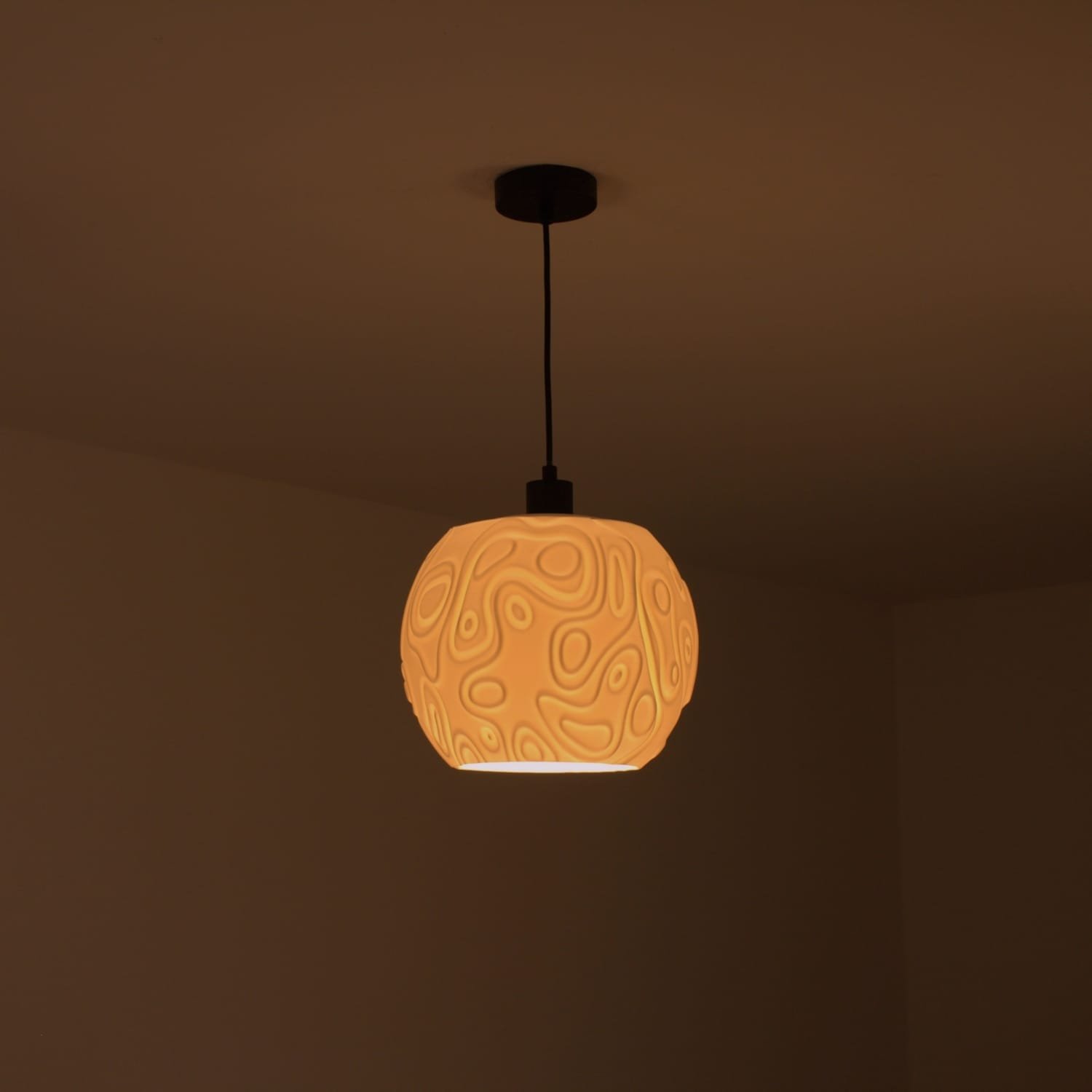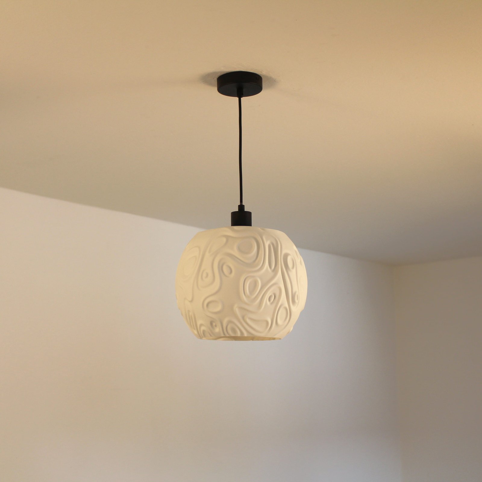 Unser Morphus Lampenschirm in der Größe M an einer 1-flammigen Pendel Armatur aus Metall.