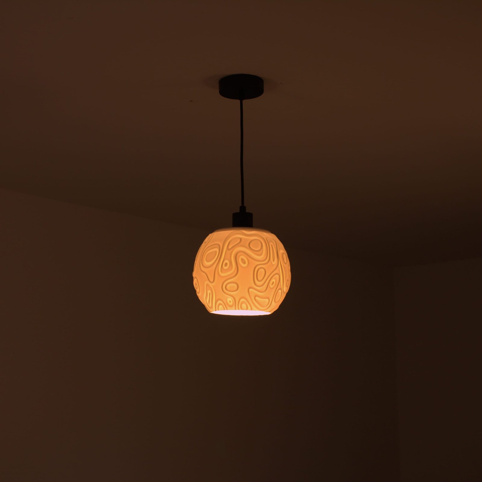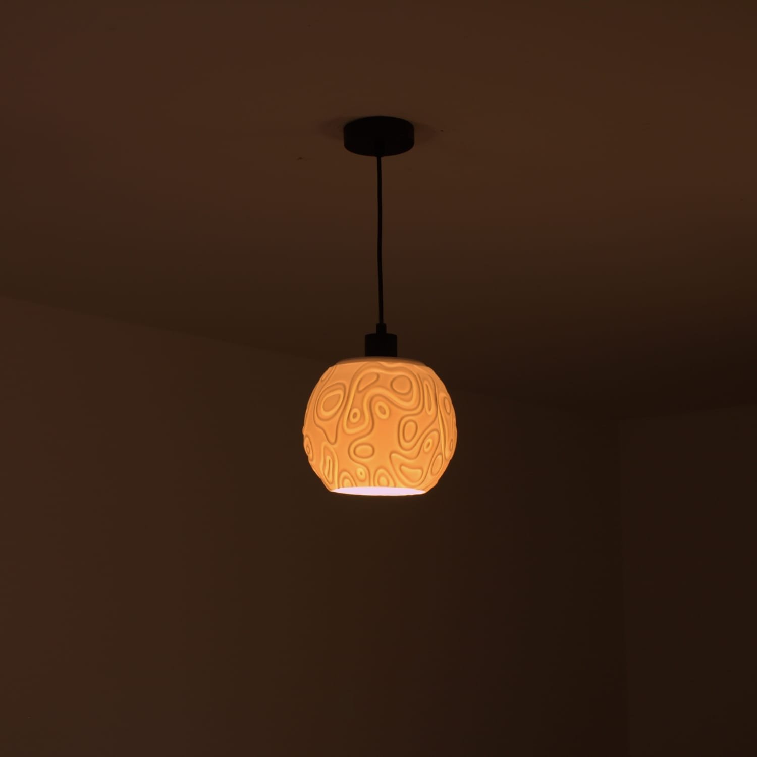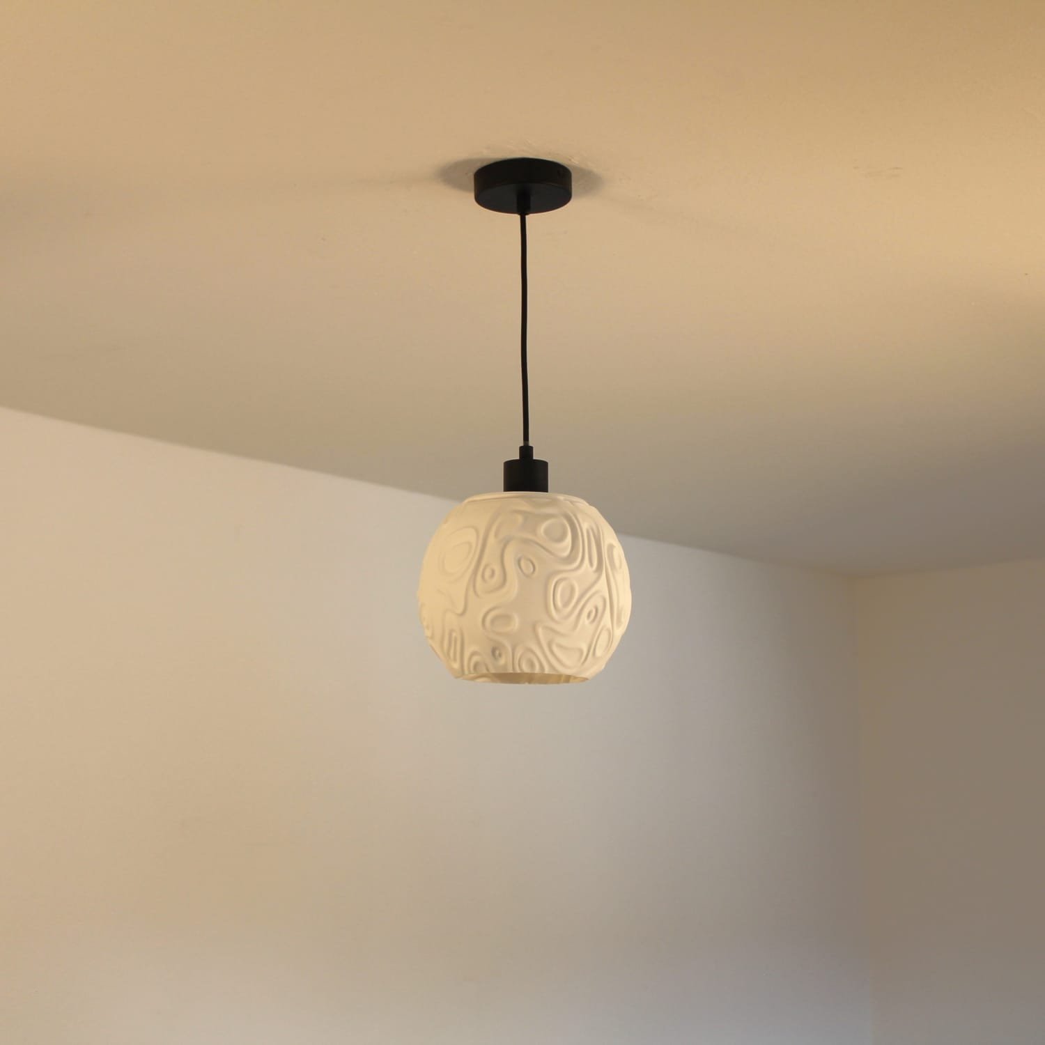 Unser Morphus Lampenschirm in der Größe S an einer 1-flammigen Pendel Armatur aus Metall.