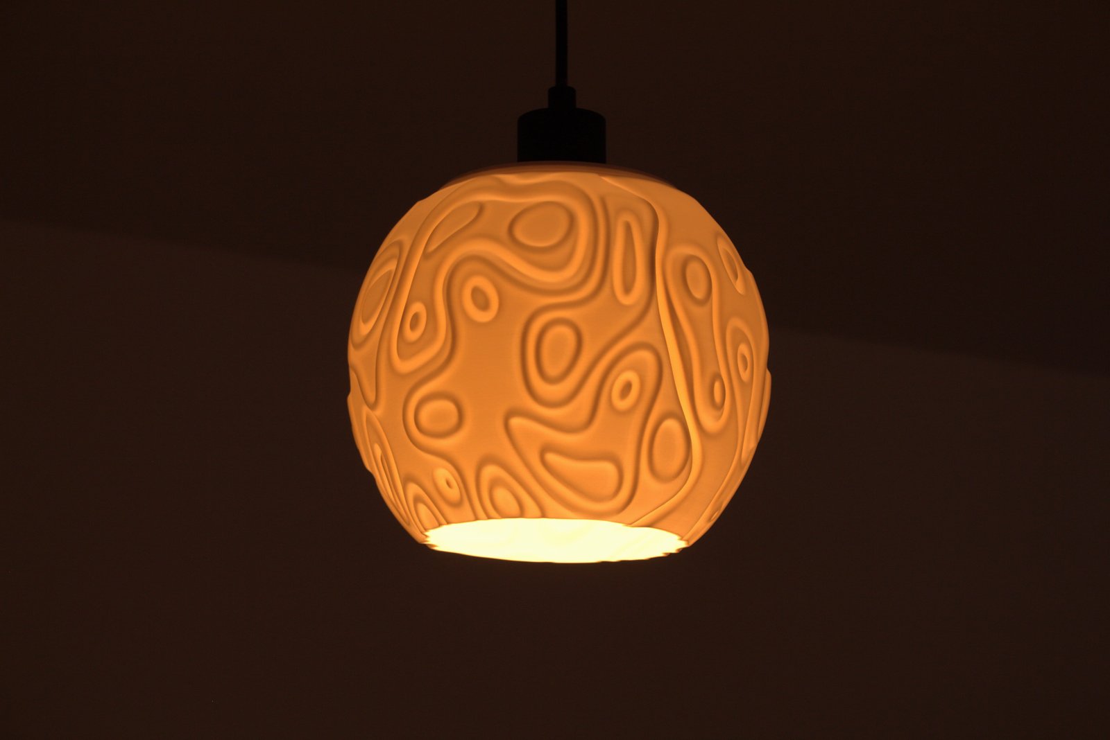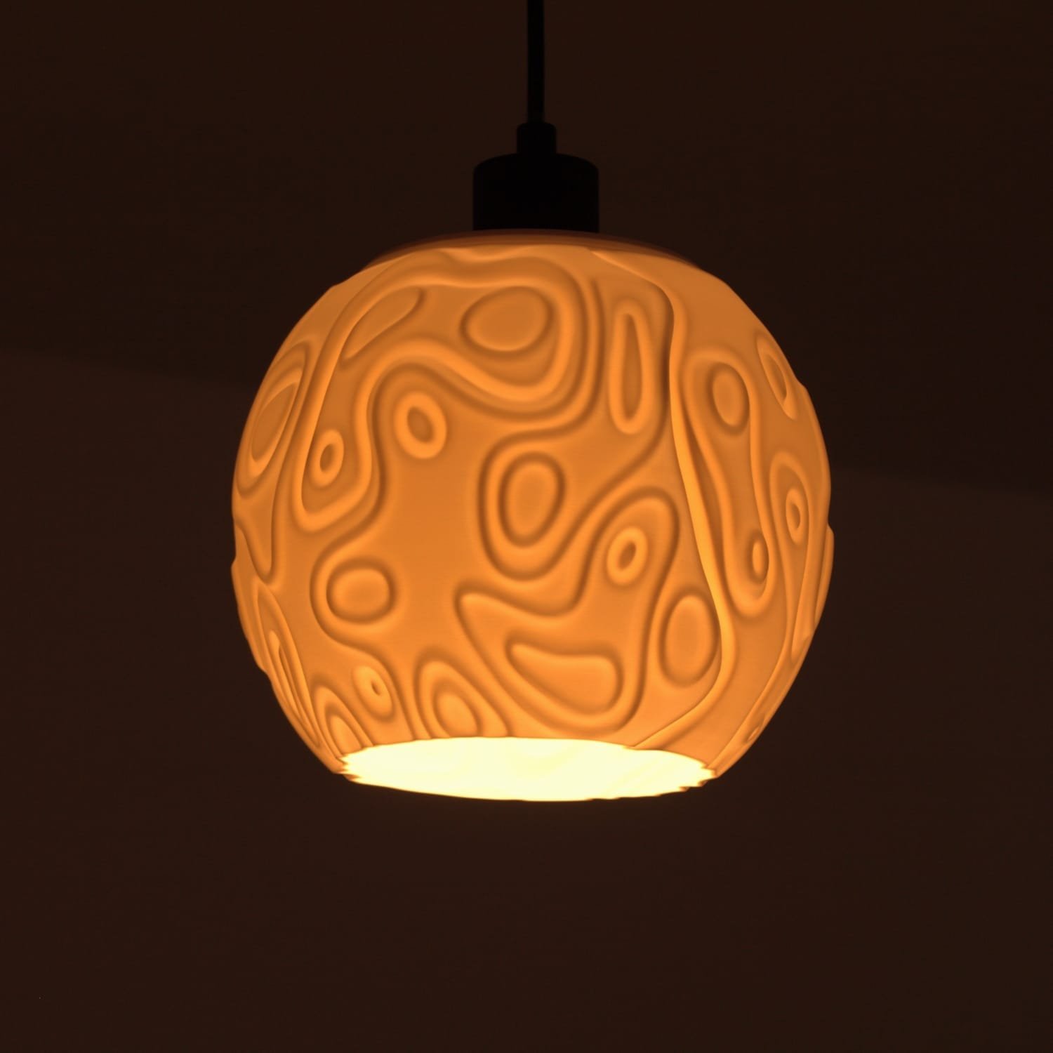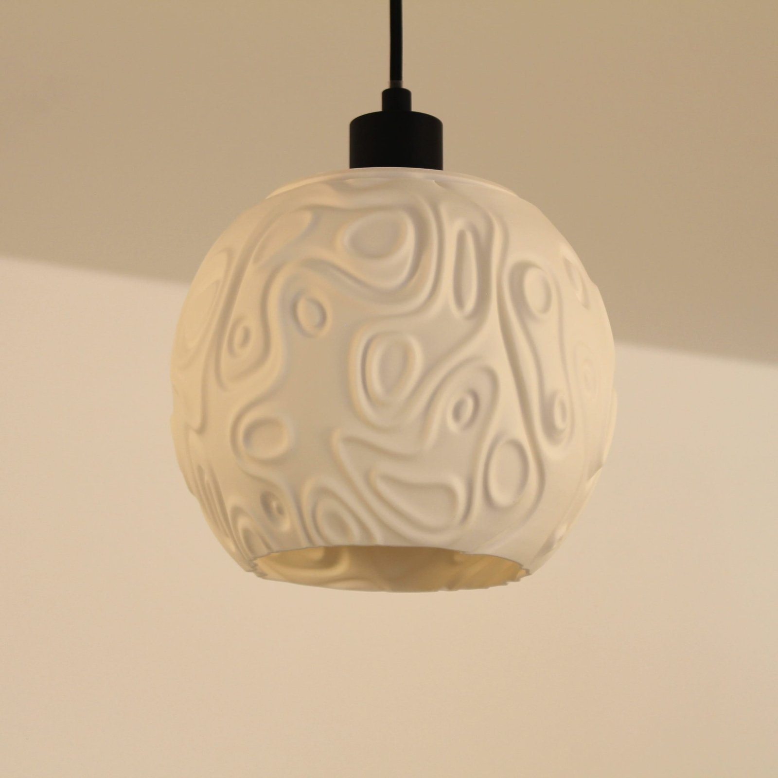Unser Morphus Lampenschirm in der Größe S an einer 1-flammigen Pendel Armatur aus Metall.